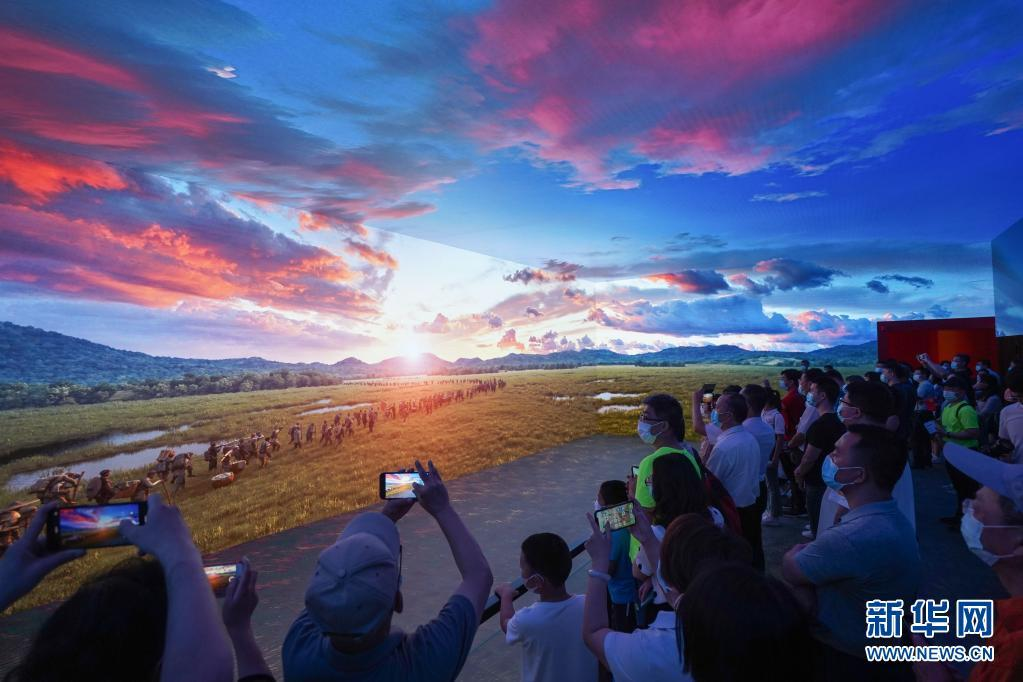 展覽尾聲部分,一條“時(shí)空隧道”令人仿佛身臨其境。大屏幕影像通過(guò)選取1921、1949、1978、2012、2020年5個(gè)重要時(shí)間節點(diǎn),在光影變幻中展現中國共產(chǎn)黨百年波瀾壯闊的歷史進(jìn)程。